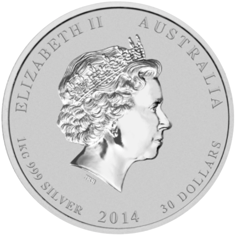 Y apparait, son nom "ELIZABETH II" en haut, le millésime de la pièce 2014, son poids 1 kilo et sa pureté 99,99% ainsi que la valeur faciale 30 DOLLARS.