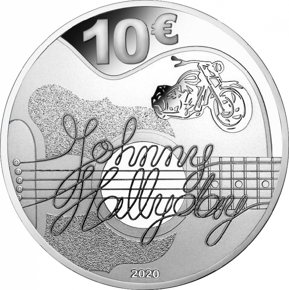 Le revers de cette pièce reprend 2 objets qui ont rythmé la vie de Johnny Halliday : sa moto et sa guitare. Les cordes de celle-ci forment son nom pour symboliser son lien profond avec cet instrument.
