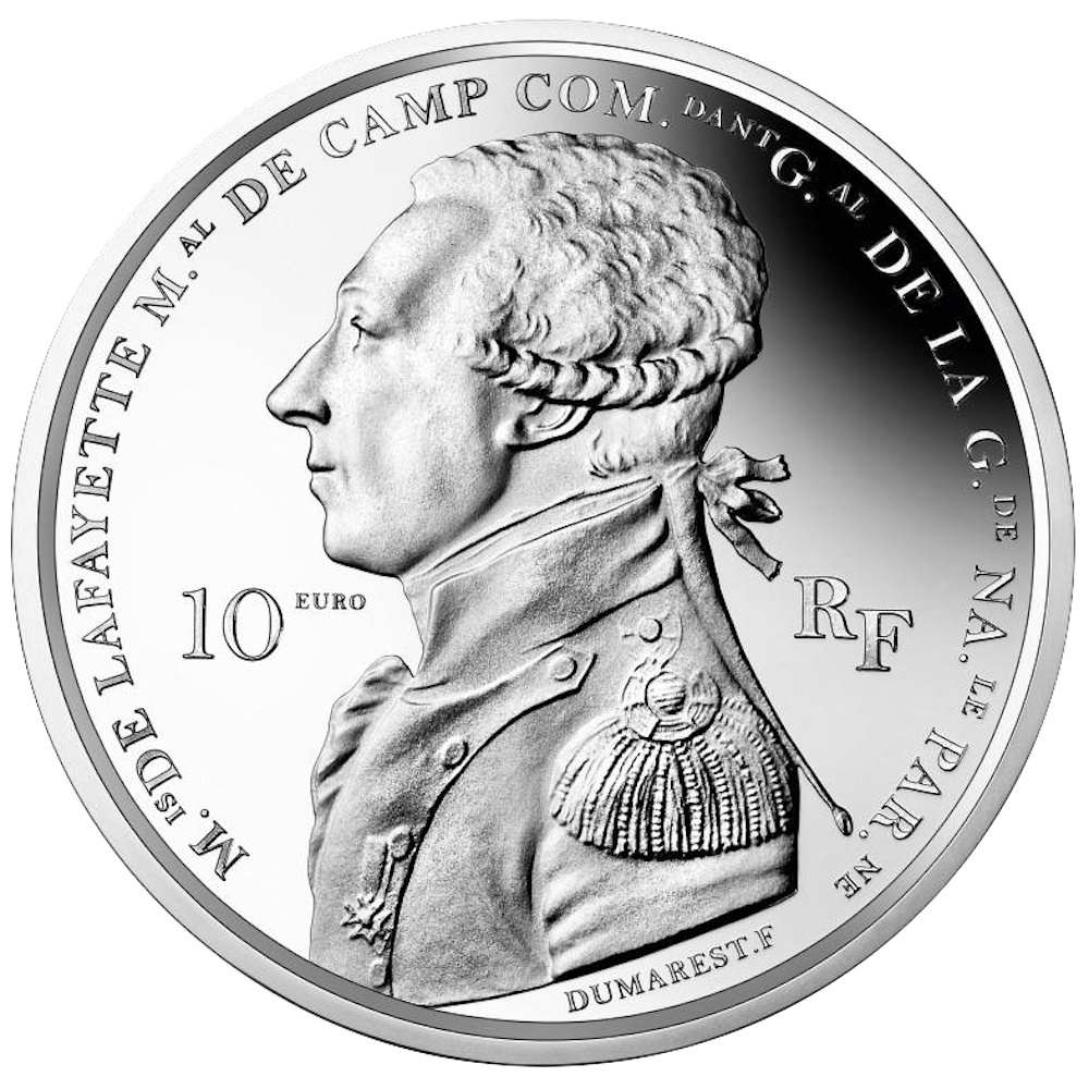 L'avers de la pièce 10 euro Arrivée de La Fayette à Boston représente le portrait du Marquis de La Fayette de profil, de la même façon qu’étaient présentées les monnaies de la Monarchie ou de l’Empire.