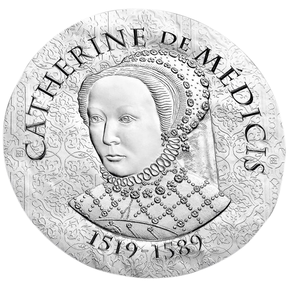 L'avers présente un portrait de Catherine de Médicis parée des habits typiques de cette époque: la coiffe et la fraise qui couvrait le haut de la poitrine jusqu’au cou.