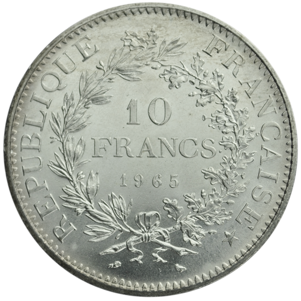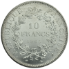 Description : 10 FRANCS écrit en deux lignes, le tout contenu dans une couronne composée à gauche d'une branche de laurier et à droite d'une branche de chêne. Elles sont nouées à leur base par un ruban. Au-dessous se trouvent deux points encadrant le millésime de la 10 francs Hercule.