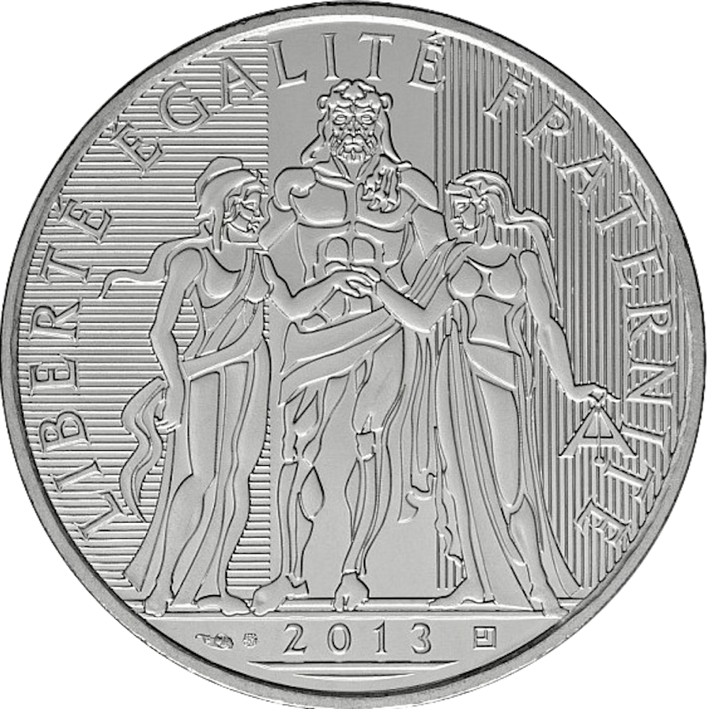 REVERS : Le revers de la pièce en Argent 100 Euro Hercule représente Hercule avec la Fraternité (à gauche d'Hercule) l'Égalité (au-dessus de la tête d'Hercule) et la Liberté (à la droite d'Hercule).