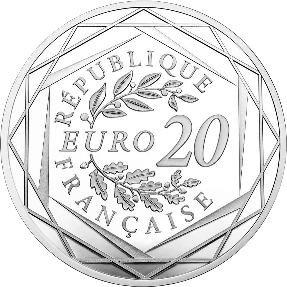 AVERS : Nous retrouvons inscrit sur l'avers de la pièce: RÉPUBLIQUE FRANÇAISE ainsi que sa valeur faciale (EURO 20) entourée de deux branches, l'une de chêne, l'autre de laurier, qui évoquent le sigle de l'Euro.