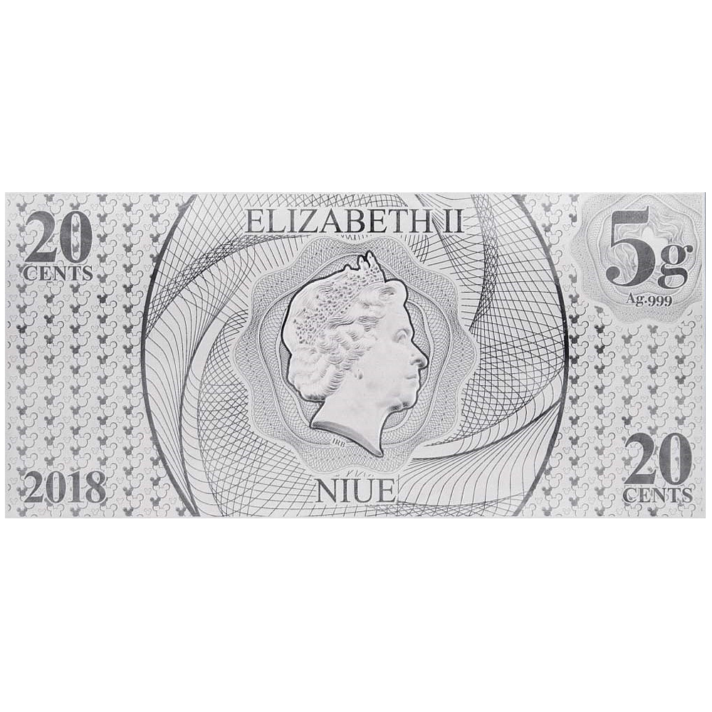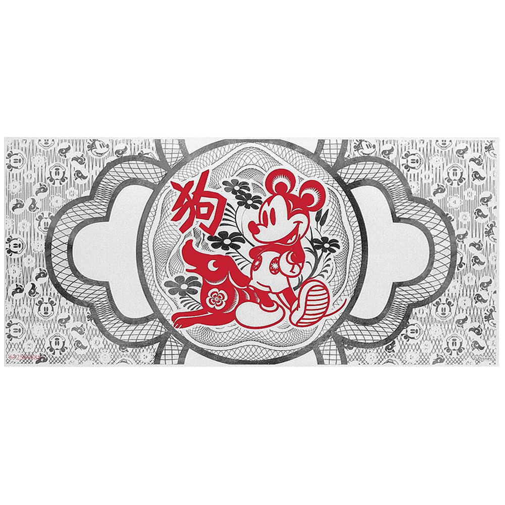 La feuille d'argent de dimension 150x70 mm est à l'intérieur d'une carte qui représente Mickey qui fête l'Année du Chien, il y a de la place pour écrire un message personnalisé.