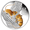 Le revers de la pièce représente deux souris colorées se nourrissant parmi des enveloppes de maïs. Le dessin comprend également le caractère chinois pour «souris», l’inscription «MOUSE 2020» et la marque «P» de la Perth Mint.