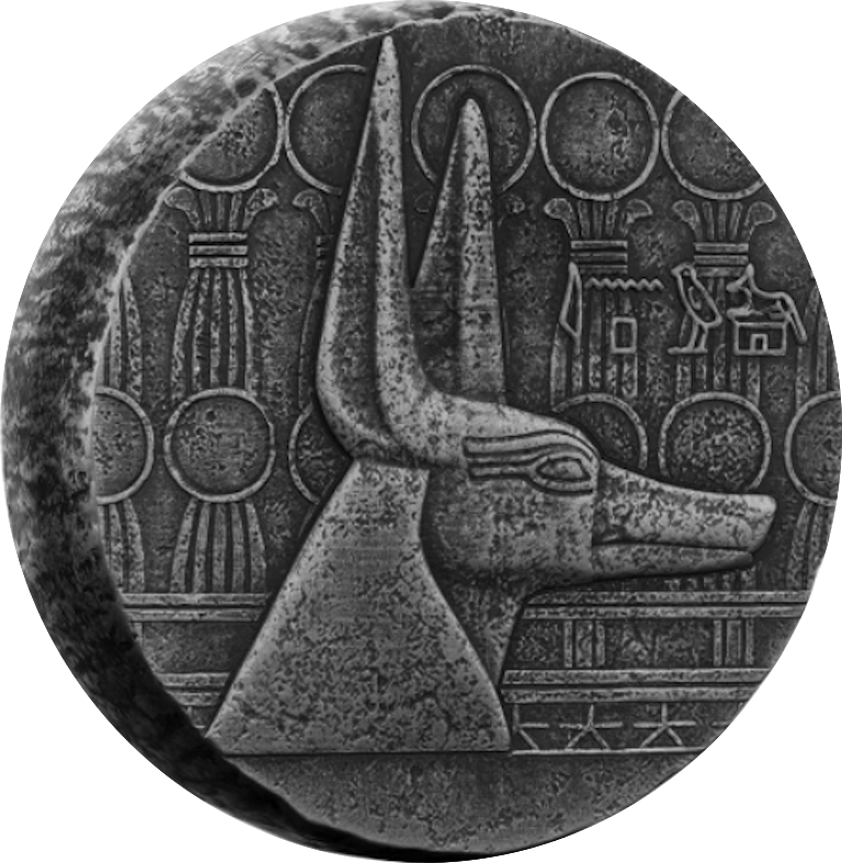 Sur l'avers de cette pièce, on distingue le divinité Anubis de profil et tournée vers la droite. Il est le dieu de l'embaumement, rite qu'il a pratiqué pour la première fois sur la personne d'Osiris et par lequel il l'a ressuscité. Derrière lui on peut voir des colonnes Egyptiennes et des hiéroglyphes.