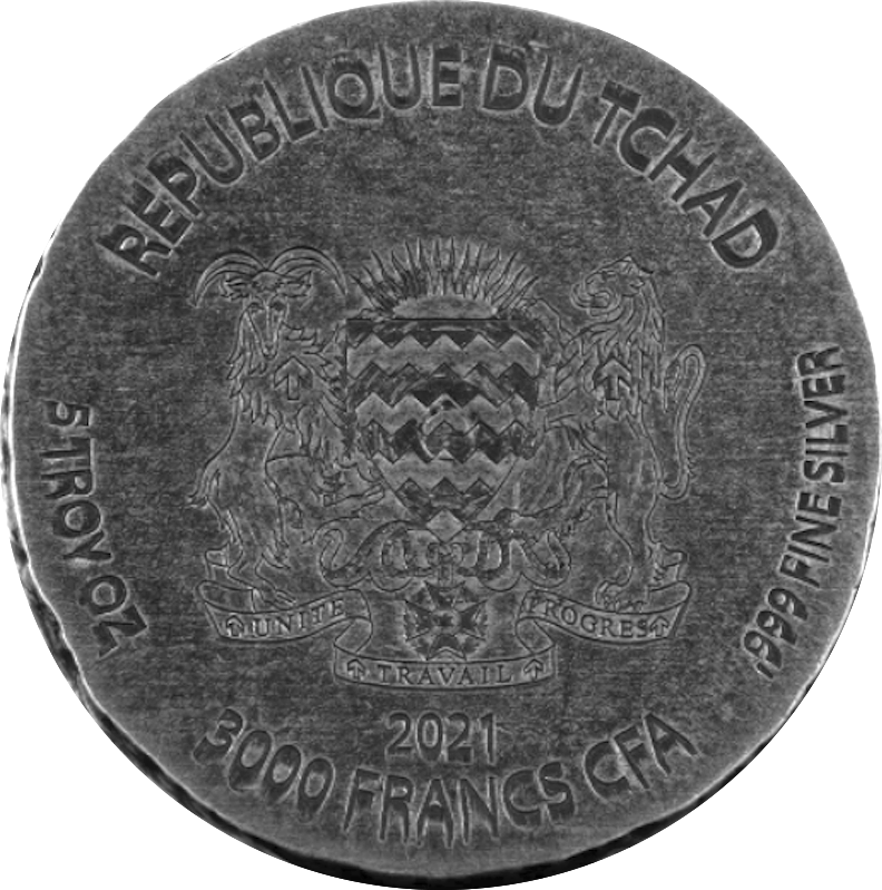 Sur le revers, les inscriptions "République du Tchad" en français, 5 Troy Oz , 3000 Francs CFA et .999 Fine Silver" entourent la pièce.