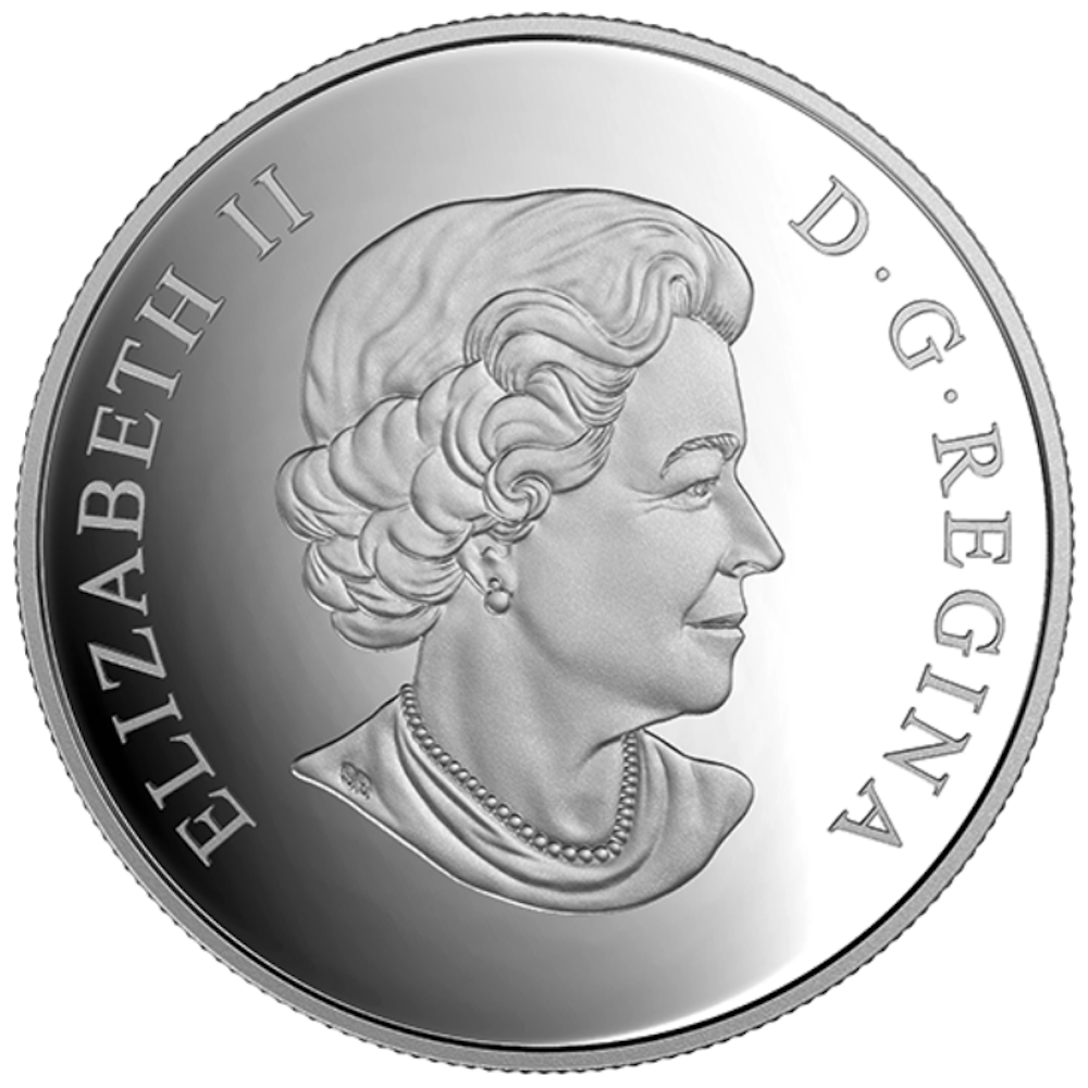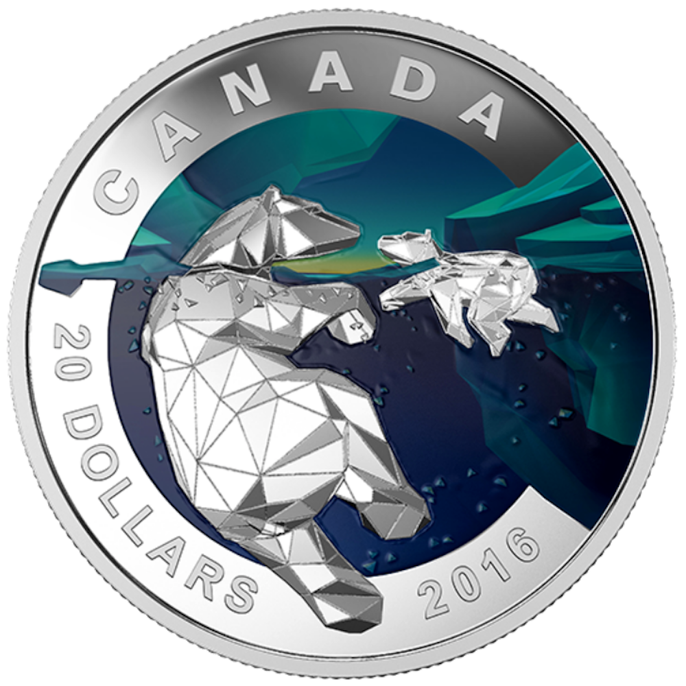 REVERS : Le motif stylisé au revers, œuvre de l'artiste canadien Calder Moore, illustre l'imposant ours polaire (Ursus maritimum), le « roi de l'Arctique » et représentant bien-aimé du Nord canadien.