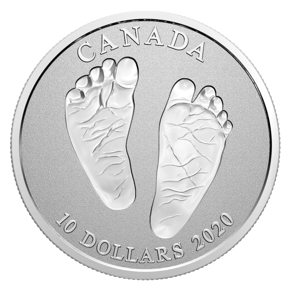 Cette pièce touchante traduit l’essence d’une période heureuse avec un motif attendrissant de pieds de bébé, frappé en creux comme des pas dans le sable. Mais à la différence du sable, l’argent fin de cette pièce préservera les empreintes pour toujours !