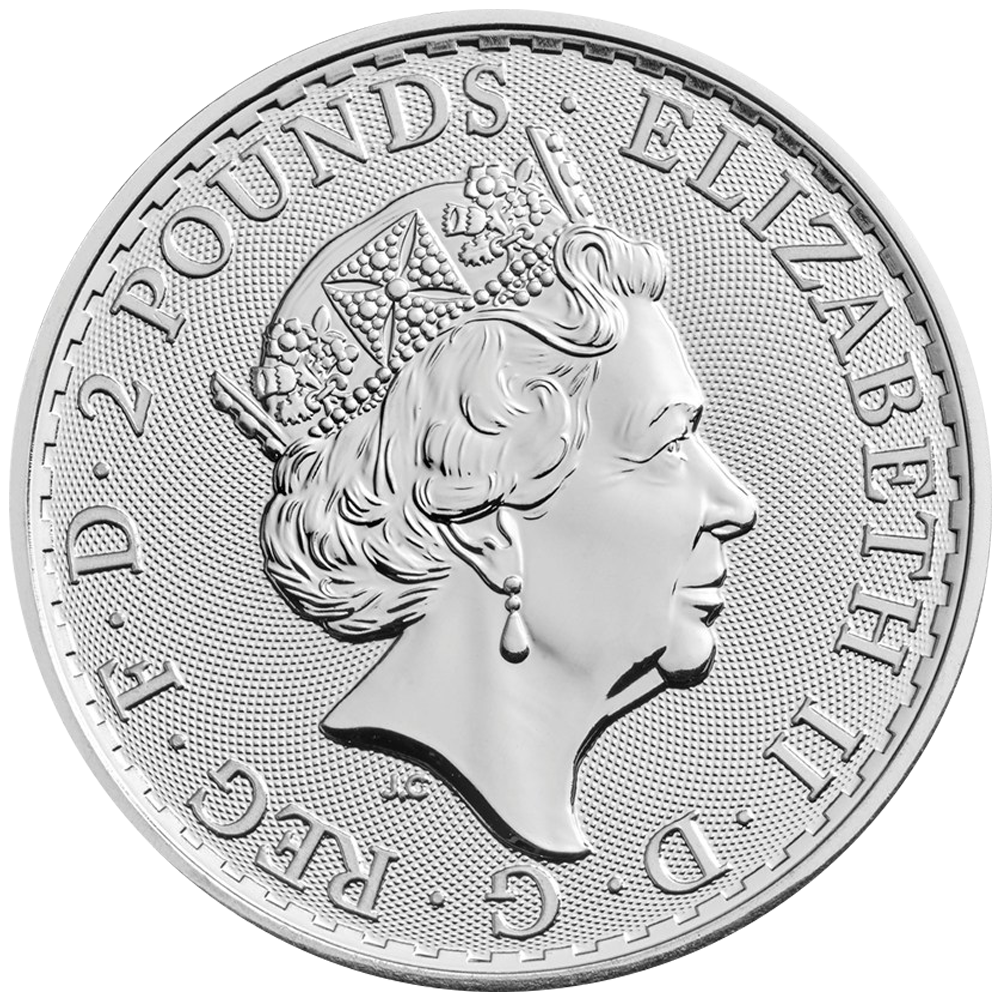 Le recto de la pièce Britannia 1 once comprend les inscriptions ELIZABETH II DEI GRATIA REGINA F D (FIDEI DEFENSOR) ainsi que la valeur faciale.