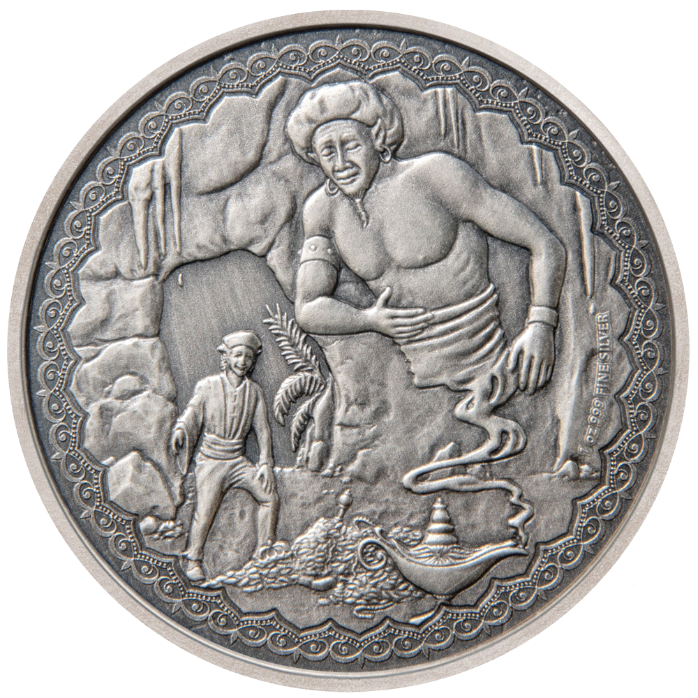 Cette pièce en argent utilise une gravure pour illustrer Aladdin dans la grotte et le génie sortant de la lampe.