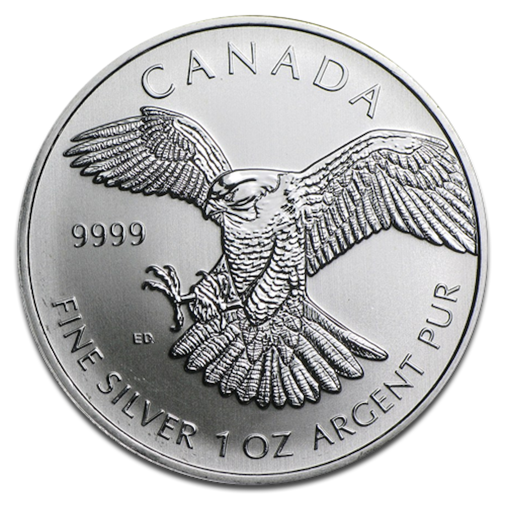 La première pièce de la série "Oiseaux de proie" (Birds of prey) de la Royal Canadian Mint représente le majestueux faucon pélerin (peregrine falcon).