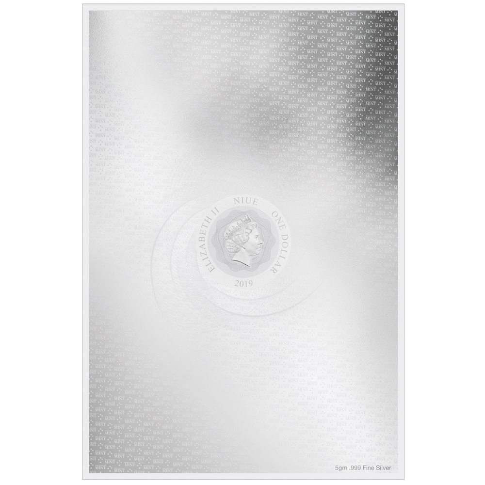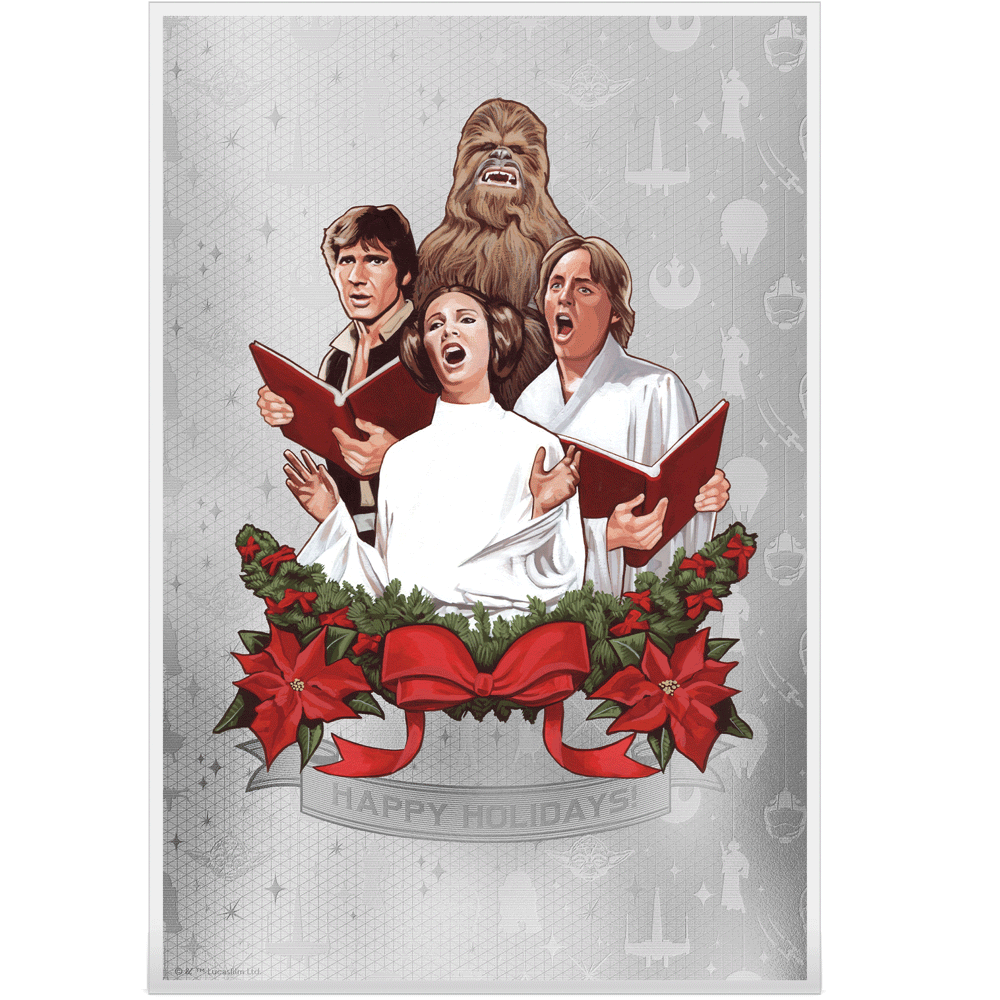 Ce billet en argent incorpore à la fois la couleur et la gravure. Il présente une image complète du Seigneur Sith, Dark Vador, qui embrasse l’esprit de Noël au coin du feu.