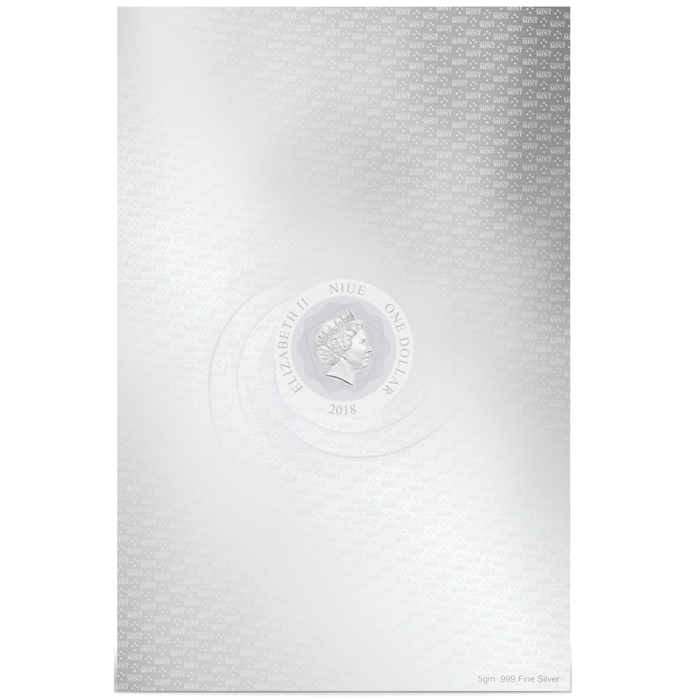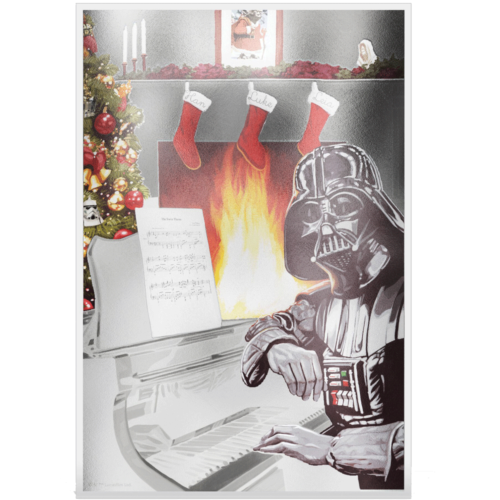 Ce billet en argent incorpore à la fois la couleur et la gravure. Il présente une image complète du Seigneur Sith, Dark Vador, qui embrasse l’esprit de Noël au coin du feu.