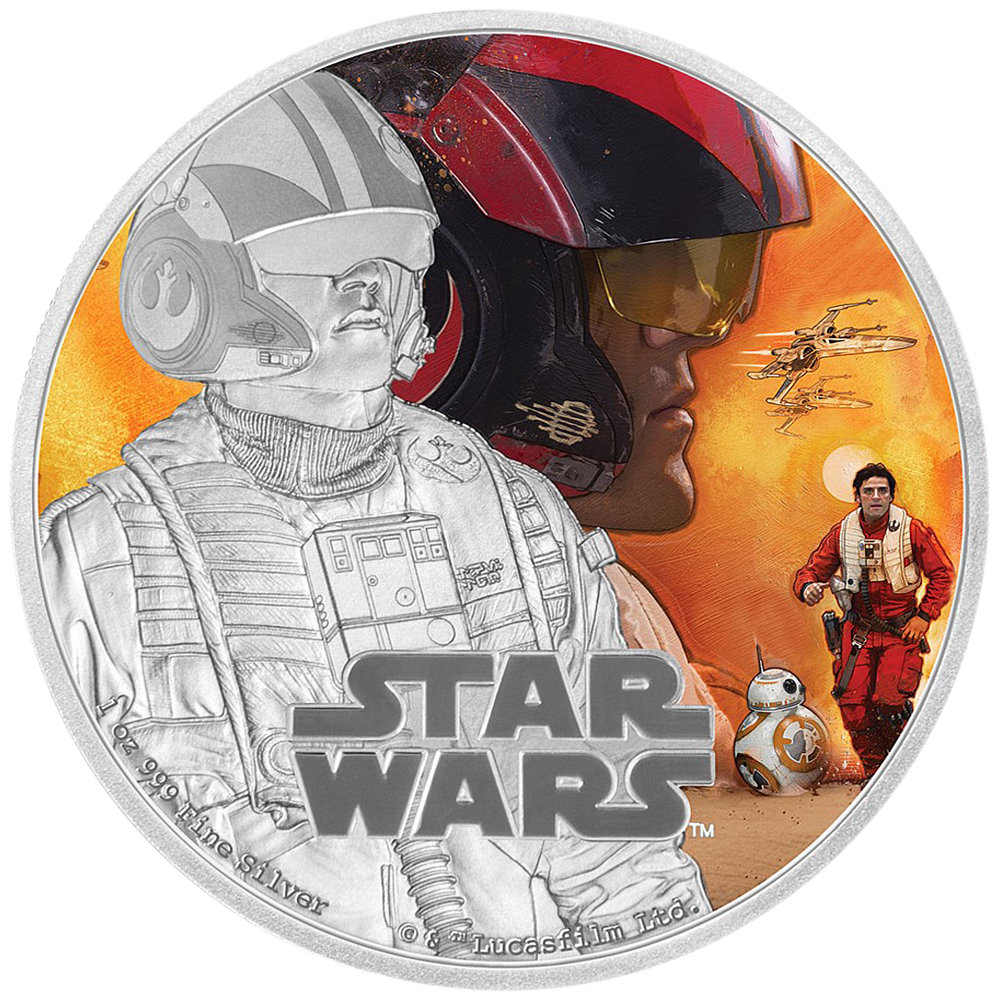 REVERS : Sur le revers de cette pièce en Argent, on retrouve Poe Dameron en version colorisée et en arrière plan 2 X-Wings survolant Poe avec son droïde BB-8.