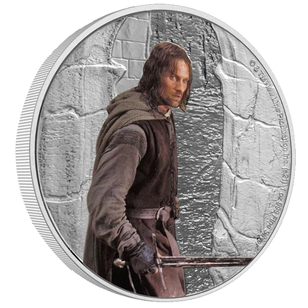 Le chef courageux Aragorn domine cette pièce en argent d'une once. Sur une face, elle montre une image colorée du guerrier Aragorn, épée à la main, sur un fond gravé. Le cours légal de cette superbe pièce de collection est confirmé par l'effigie de Sa Majesté la reine Elizabeth II sur l'avers.