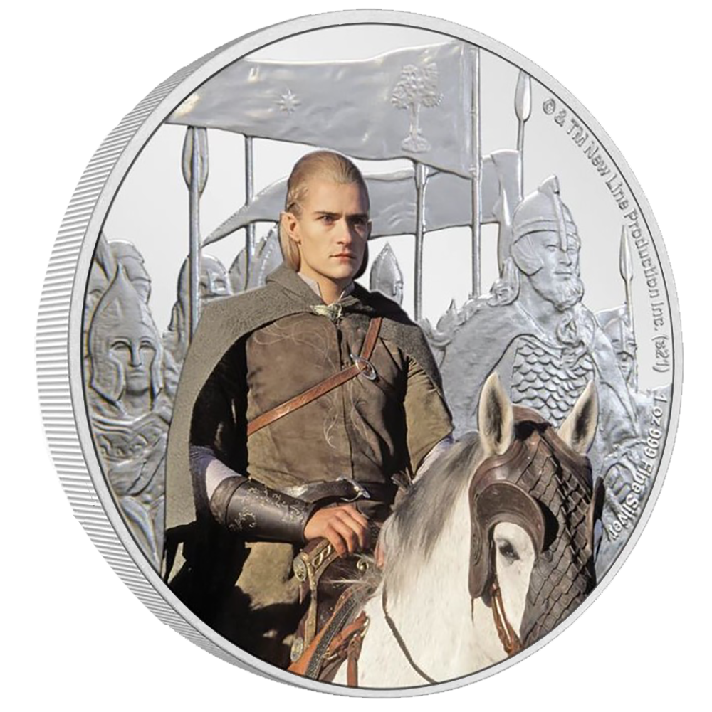 Cette pièce en argent d'une once représente Legolas, un membre loyal de la Communauté de l'Anneau. D'un côté, nous célébrons ses talents de cavalier avec une image colorée de Legolas chevauchant son fidèle destrier Arod alors qu'ils attendent le début de la bataille. Le fond gravé représente ses compatriotes de combat. Le cours légal de la pièce est confirmé par l'effigie de Sa Majesté la reine Elizabeth II sur l'avers.