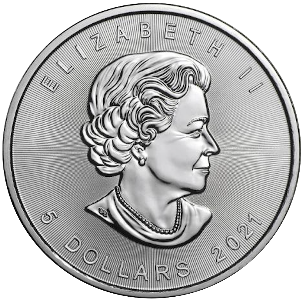 L'avers de la pièce Maple Leaf 1 once représente un buste de la reine Elizabeth II, dont le design a changé en 1990 pour représenter un portrait de la reine mature.