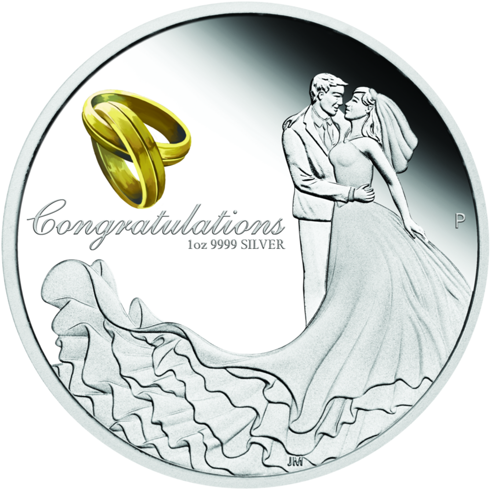 La face inclus 2 alliances dorées, l'inscription CONGRATULATIONS ainsi que la teneur en argent de la pièce.