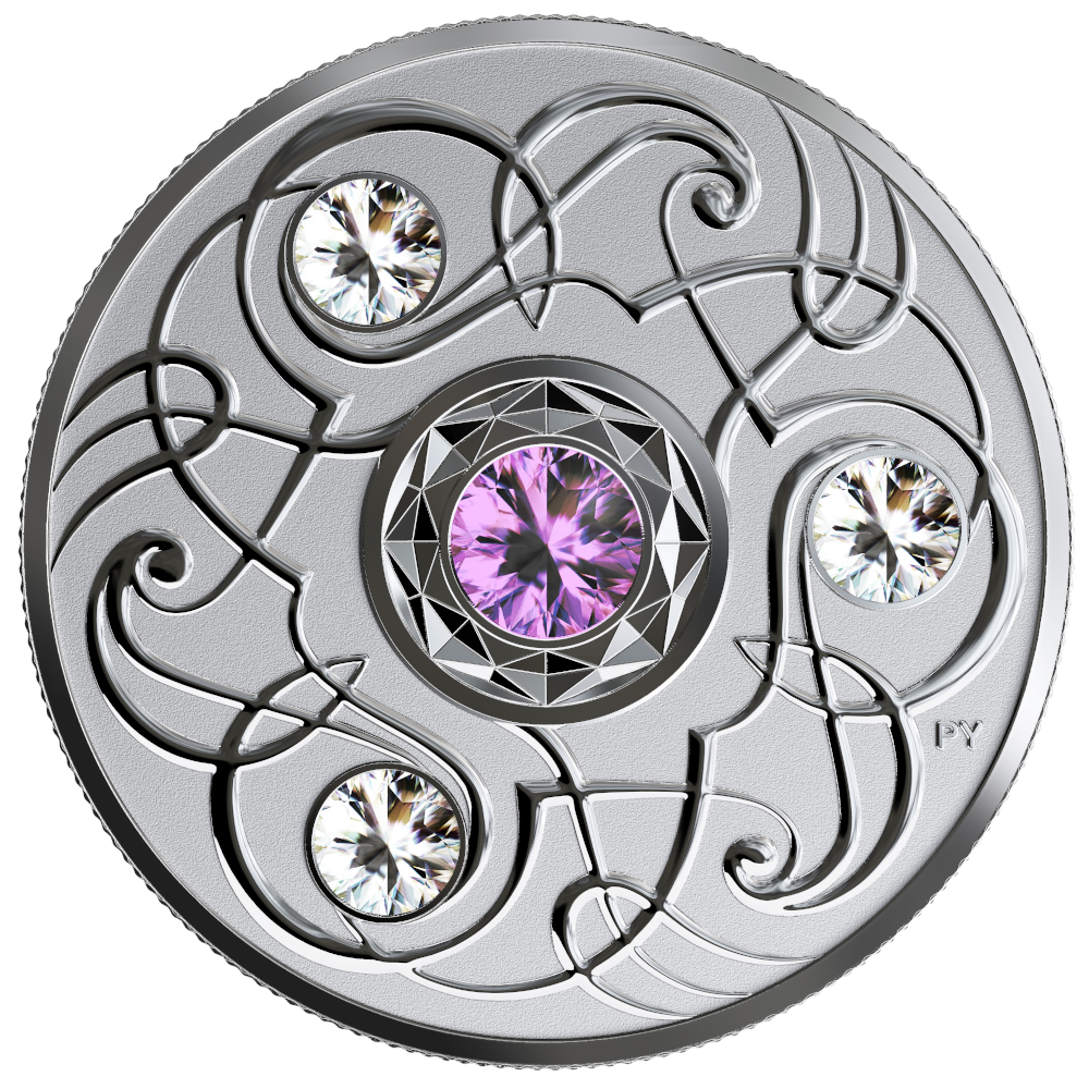 Une image prisée dans l'art henné – le lotus – y tient la vedette, entre autres détails finement ciselés au centre du motif, où un cristal SwarovskiMD coloré représente la pierre de naissance de février, l'améthyste.