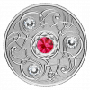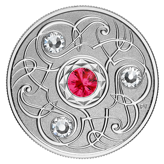 Le design de l'artiste Pandora Young inspiré de l'art celtique et incorpore trois cristaux Swarovski® autour de la pierre de naissance de Juillet, le rubis, au centre de la pièce.