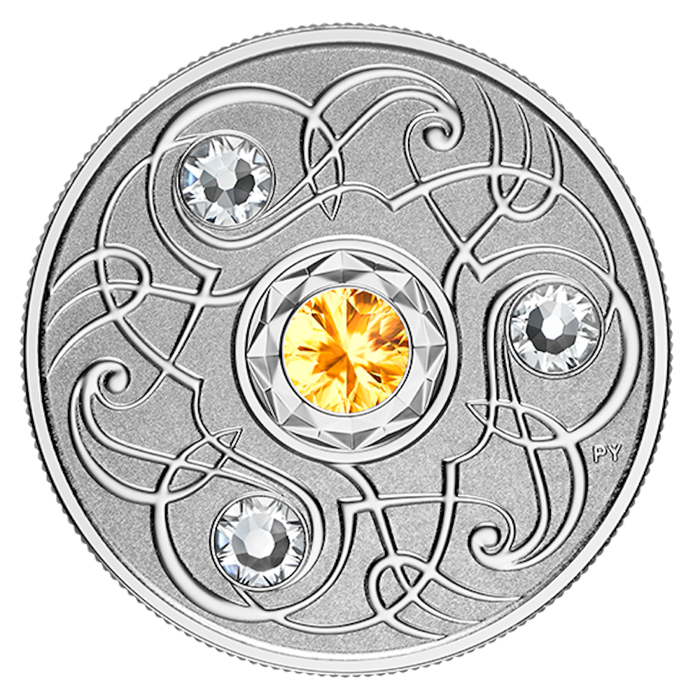 Œuvre de Pandora Young, le motif de cette pièce nous offre une célébration multiculturelle inspirée du mehndi, ancienne tradition indienne. Cette composition symétrique de formes et de symboles raffinés crée un motif radial à 12 pointes, reflétant ainsi tous les mois de l’année. Une image prisée dans l’art du henné – le lotus – y tient la vedette, entre autres détails finement ciselés au centre du motif, où un cristal SwarovskiMD coloré représente la pierre de naissance de novembre, la topaze. Une coloration sélective s’agence à la pierre, et un joyeux contraste entre les tons vifs et doux fait ressortir le complexe jeu de reliefs du motif gravé.