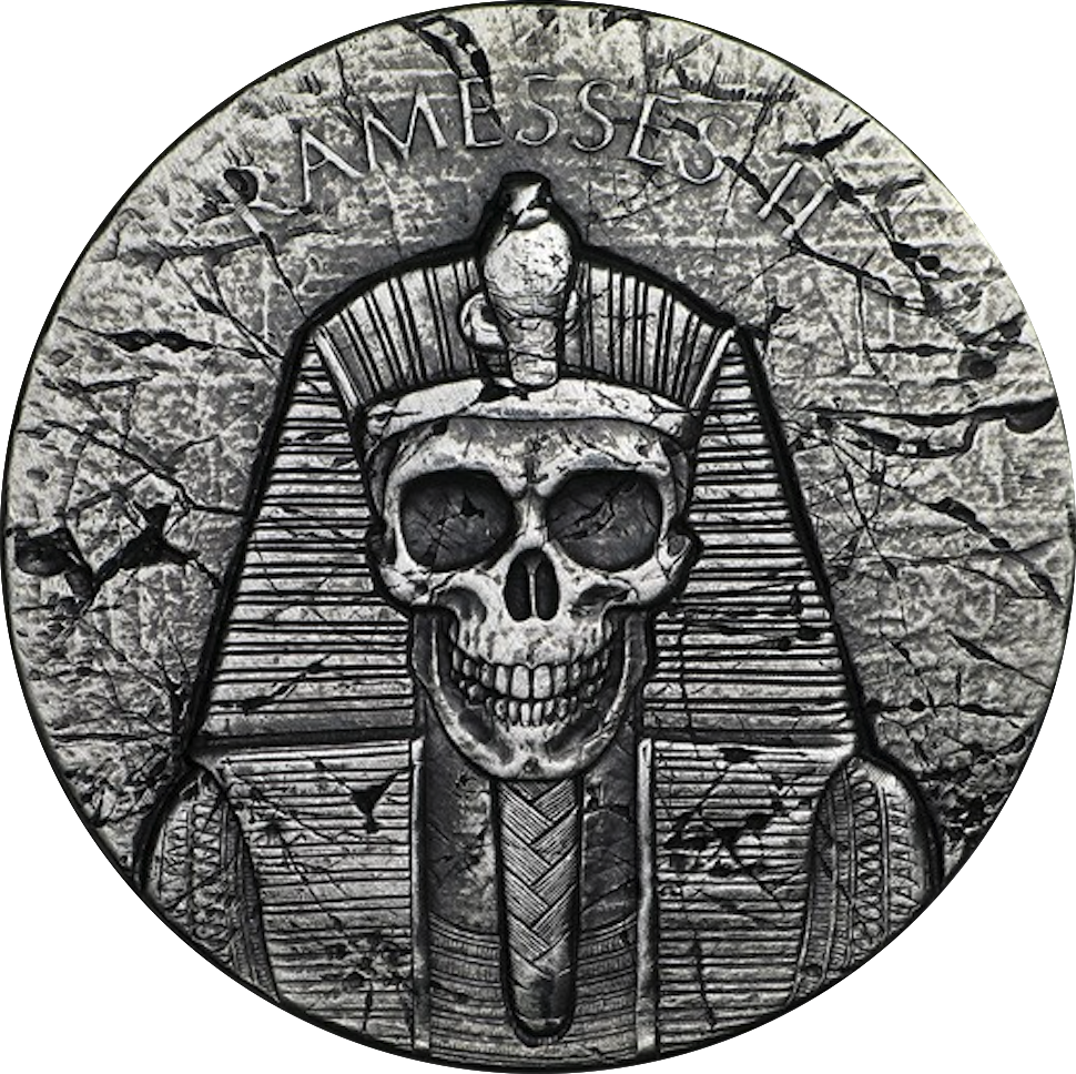 À l'avers, on aperçoit le squelette du pharaon Ramsès II d'Égypte. Conçu de manière à ressembler à un objet trouvé dans un tombeau , le champ de la pièce est orné de fissures étonnamment réalistes, de marques de burin et de hiéroglyphes délavés, ainsi que du nom du pharaon, le seul texte inscrit à l'avers.