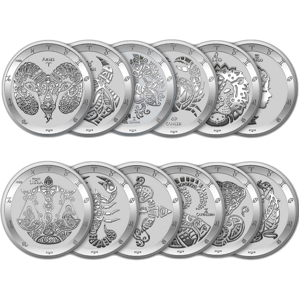 Chaque pièce contient 1 once d'argent fin .999. et reprend l'un des douze signes astrologiques : le Bélier, le Taureau, les Gémeaux, le Cancer, le Lion, la Vierge, la Balance, le Scorpion, le Sagittaire, le Capricorne, le Verseau et les Poissons.