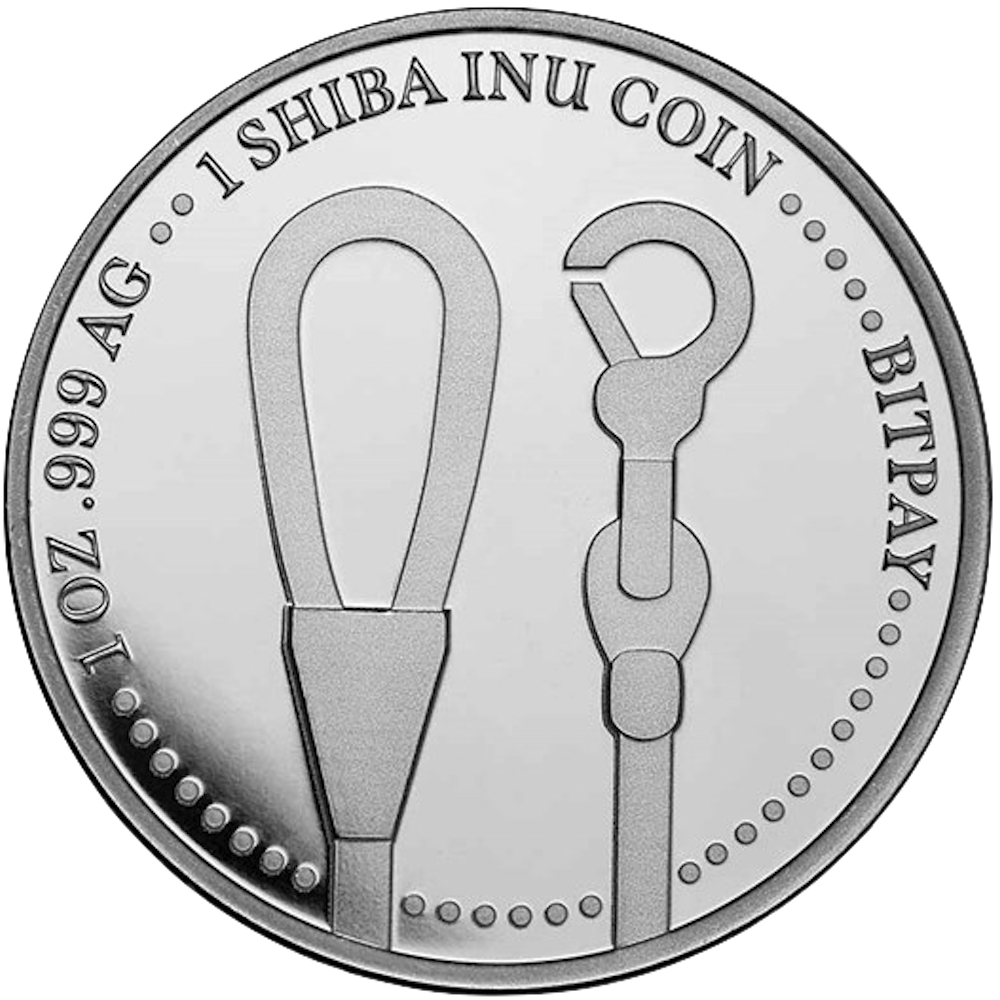 Le revers illustre les éléments de la boucle et du fermoir d'une laisse de chien. "1 SHIBA INU COIN", "BITPAY", le poids et la pureté sont affichés le long du bord.