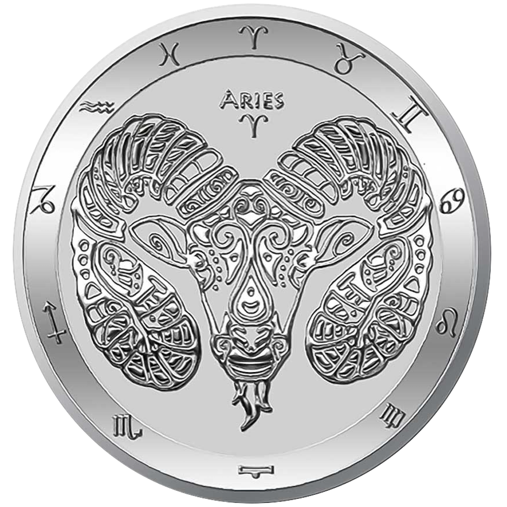 L'avers de la pièce montre une tête de bélier, stylisée. L'inscription "Aries" (Bélier en anglais) ainsi que son symbole graphique apparaissent au-dessus des imposantes cornes du bélier. Nous retrouvons également les 12 constellations du zodiaque sur la titulature.