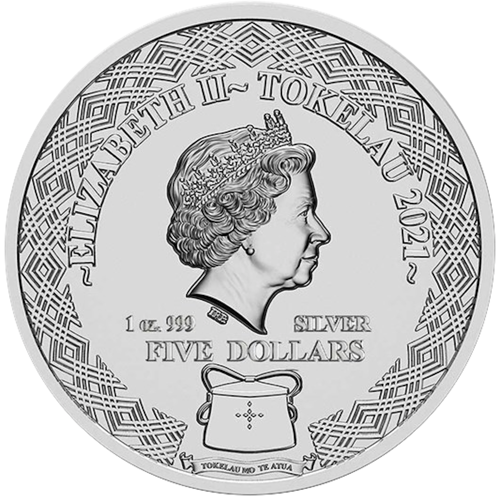 Quant au revers on y voit le portrait de la reine Elisabeth II avec le Tuluma, symbole national des Tokélaou ainsi que sa valeur faciale.