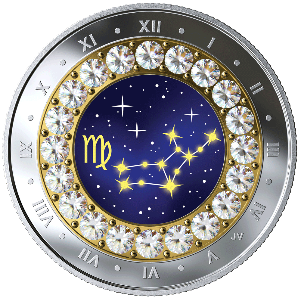 Une par une, les 12 constellations du zodiaque illuminent le ciel dans la série Signes du zodiaque 2019 de la Monnaie royale canadienne. La neuvième pièce est consacrée au déterminé Vierge (21 aout - 20 septembre); la constellation du signe y est entourée de 20 cristaux SwarovskiMD qui brillent comme des étoiles.