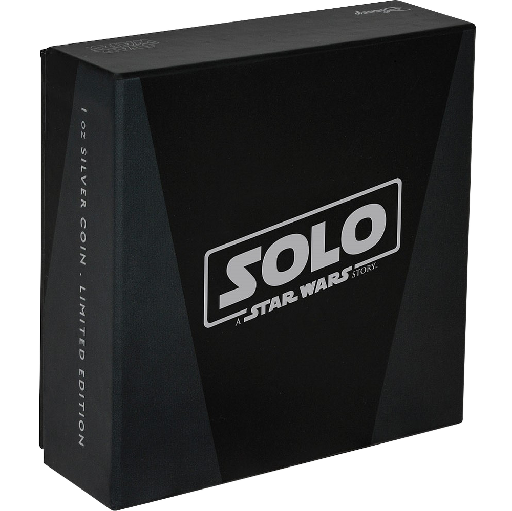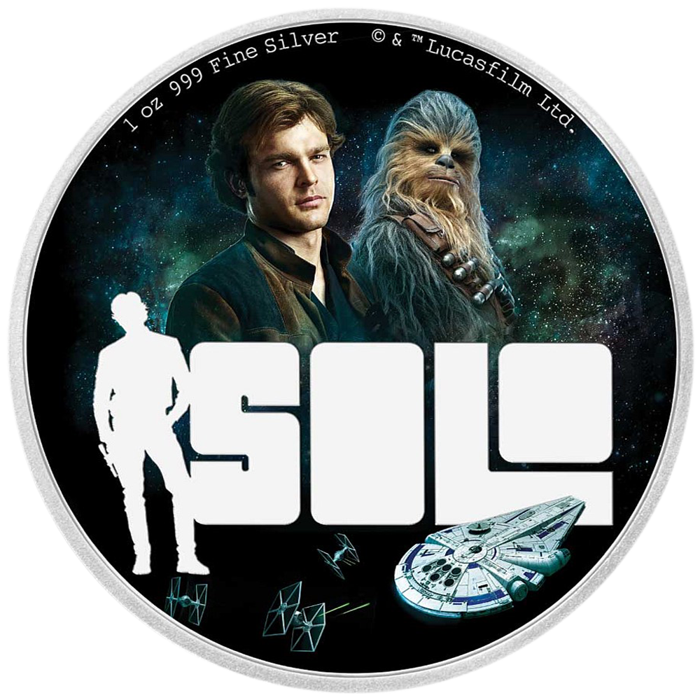 Cette pièce d'une once en argent pur présente le jeune Han Solo et Chewbacca avec leur légendaire Faucon Millenium.