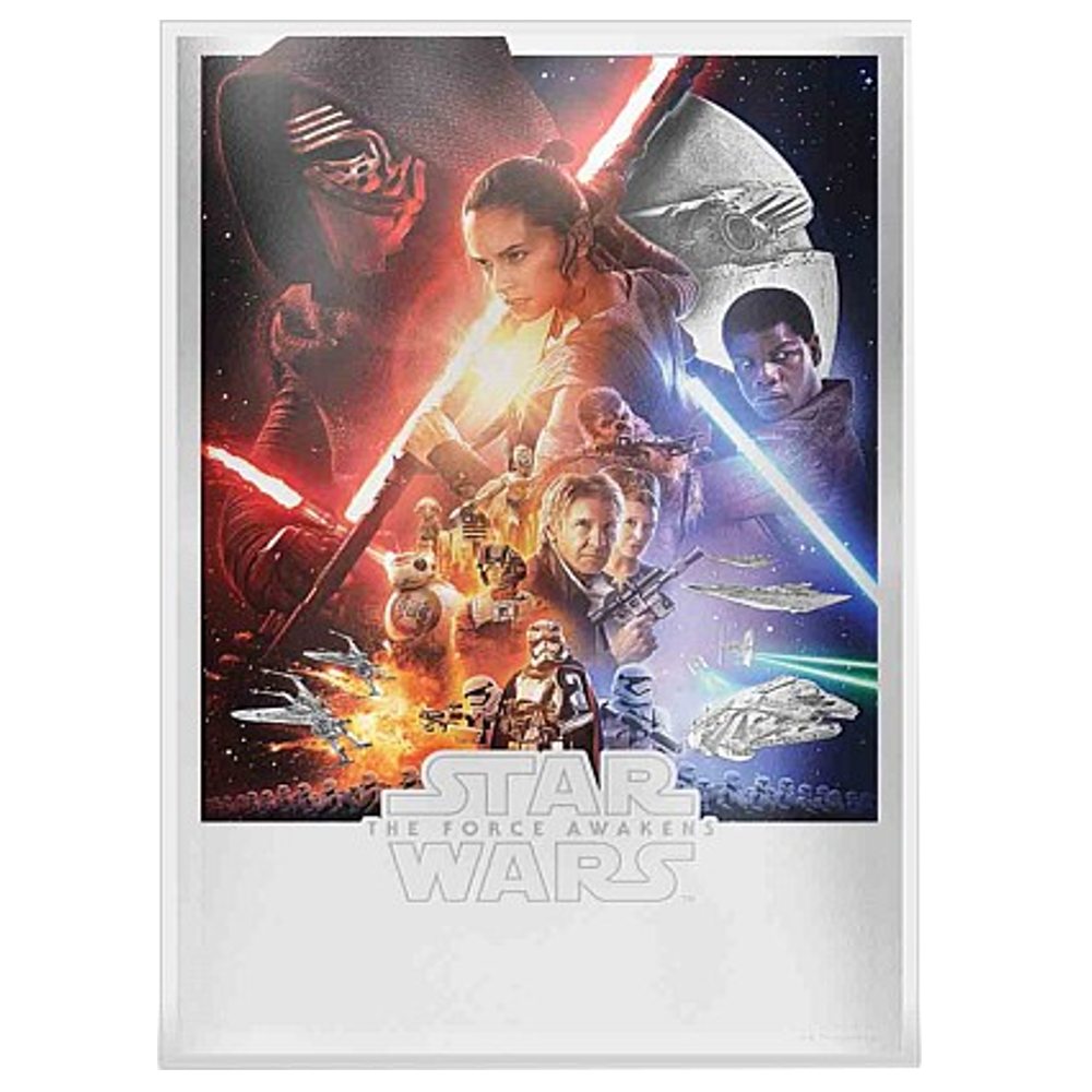 Cette affiche distinctive en métal précieux prend vie à la fois par la couleur et par la gravure. Fabriqué sur 35g d’argent fin, cet objet de collection très recherché est présenté dans un support acrylique innovant qui encadre le film et permet un affichage facile.