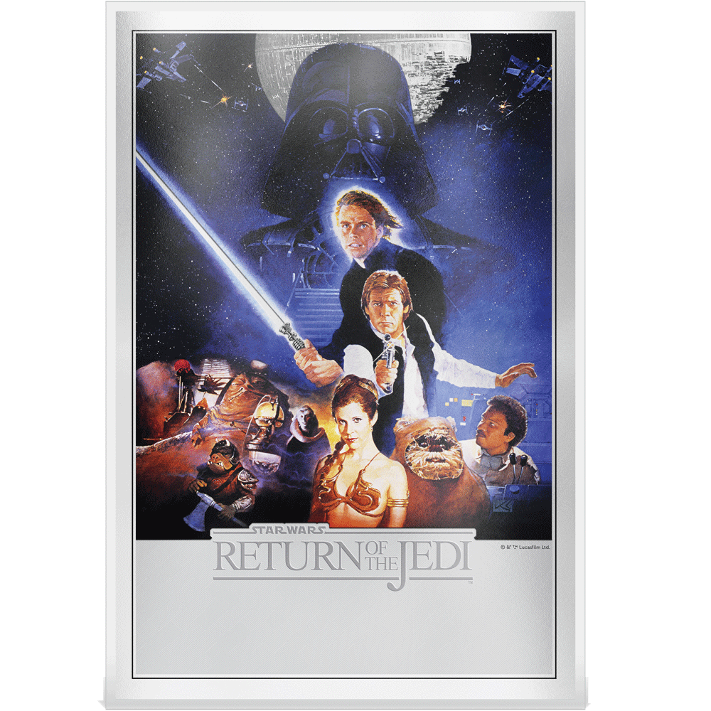 La conclusion passionnante de la trilogie épique originale de Star Wars : Le Retour du Jedi, est commémorée sur cet unique billet d’argent de qualité supérieure, présentant une réplique de l’affiche du film.