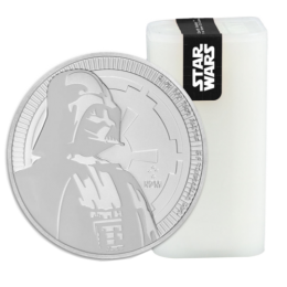 Sur le revers, on observe le profil voire trois quarts de l’emblématique Jedi déchu, en arrière-plan, un bas-relief rappelle l’univers des films et particulièrement l’Empire galactique. La titulature est visible sur le pourtour et nous renseigne sur le titre mais également les mentions légales dont on se passerait bien « 1 oz 999 Fine Silver – Lucasfilm Ltd ». Dans la partie inférieure du revers on remarque les initiales de la Mint « NZM »