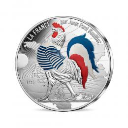 L’avers de la pièce est décoré d’un coq gaulois revêtu de l’incontournable marinière, sa crête, la marinière ainsi que les plumes de sa queue sont colorisées. A l’arrière-plan on distingue une carte de la France et dans la partie inférieure gauche la représentation traditionnelle d’un village français. Sur le pourtour, on peut lire "LA FRANCE – par Jean Paul Gaultier". Sur la partie gauche on peut voir le soleil qui illumine la pièce de ses rayons.