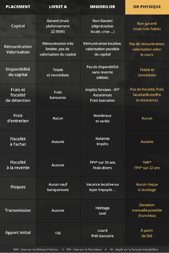 Les investissements dans l'or, l'immobilier et le livret A ont des caractéristiques différentes en termes de rendement, de risque et de liquidité. Voici une comparaison générale de ces investissements :