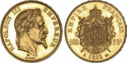 De 1855 à 1859, ce ne sont pas moins de 346 101 pièces de 100 Francs Napoléon Tête Nue qui auraient été frappées. Puis de 1862 à 1870, 97 210 exemplaires de la 100 Francs Tête Laurée furent émis, or il n’en subsisterait que 19 000 de nos jours dont le millésime le plus rare : le sous-type de 1864, disponible en seulement 1 000 exemplaires.