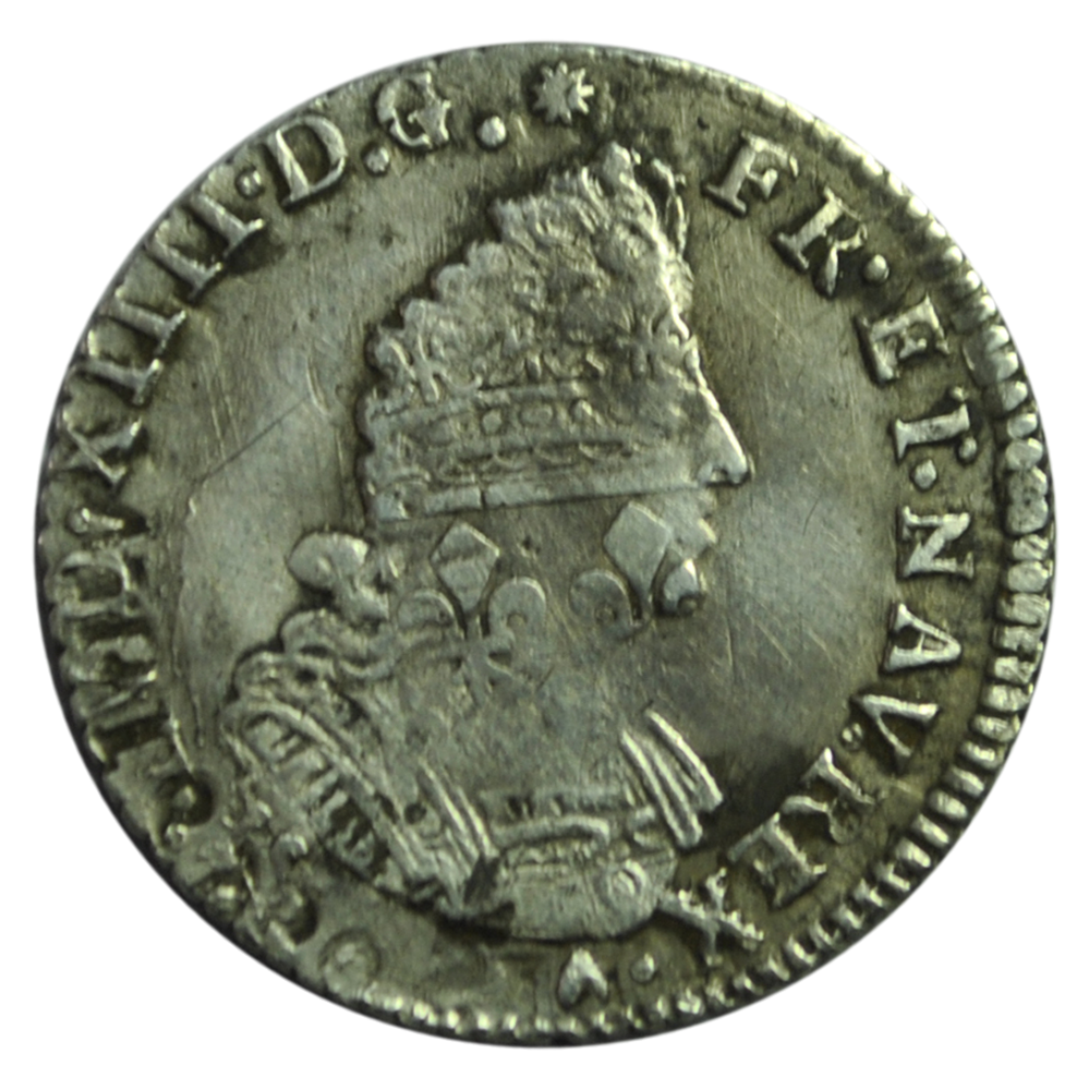 Légende : .LVD. XIIII. D. FR. ET. NAV. REX. (Louis XIV, par la grâce de Dieu, roi de France et de Navarre.)