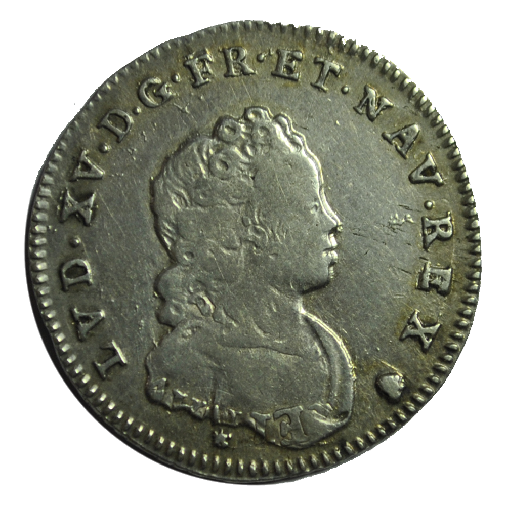 Légende : LVD. XV. D. G. FR. ET. NAV. REX .(Louis XV, par la grâce de Dieu, roi de France et de Navarre.)