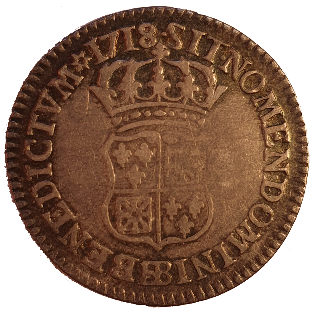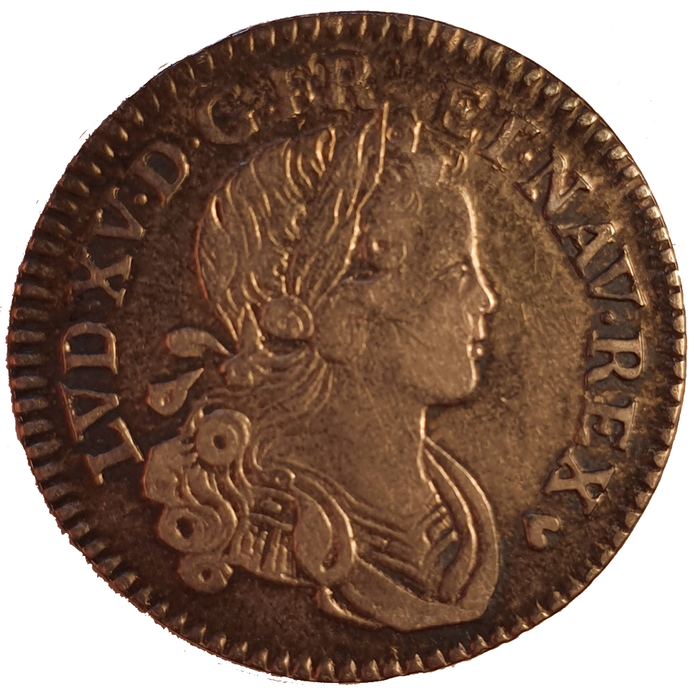 Légende : LVD. XV. D. G. FR. ET. NAV. REX. (Louis XV, par la grâce de Dieu, roi de France et de Navarre.)