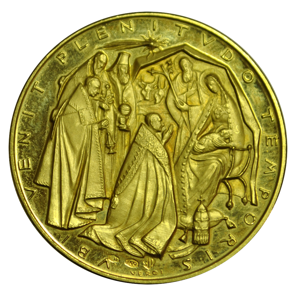 Description : Paul VI à genoux devant la vierge Marie tenant un enfant dans ces bras , en retrait les rois mages . Titulaire : VENIT PLENITVDO TEMPORIS