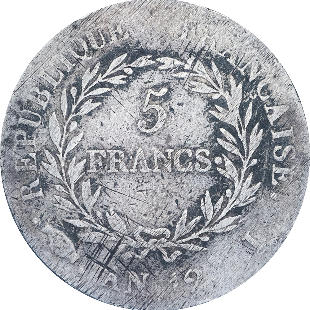 Légende : RÉPUBLIQUE FRANÇAISE 5 FRANCS AN 12 I