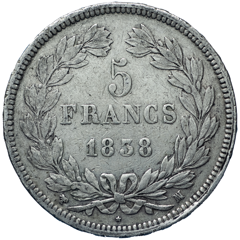 Description : tête de Louis-Philippe Ier à droite portant une couronne de chêne terminée par un ruban descendant le long du cou.