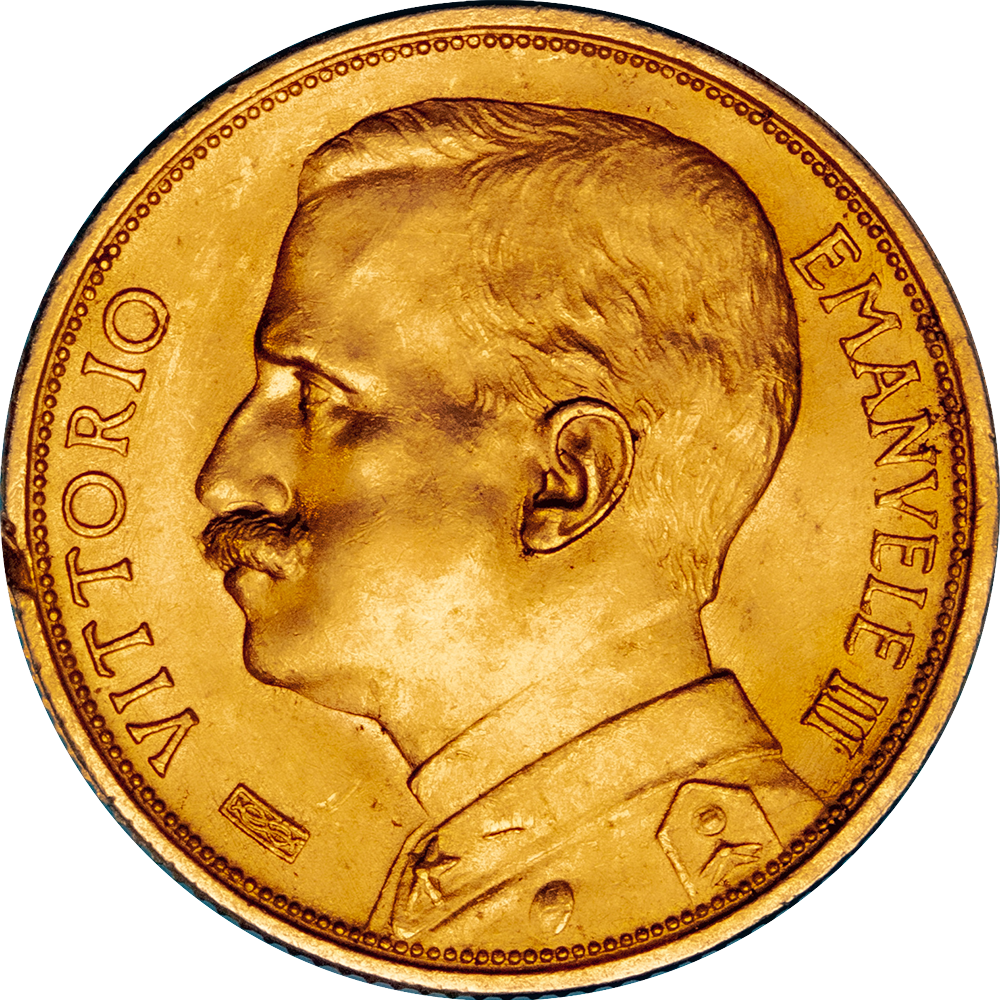 Victor-Emmanuel III, né le 11 novembre 1869, est le fils d'Humbert Ier et de Marguerite de Savoie, et le petit-fils de Victor-Emmanuel II. Il épouse Hélène de Monténégro, la fille de Nicolas Ier, en 1896. Après l'assassinat de son père par un anarchiste en 1900, il monte sur le trône. Ce roi est bien connu des numismates pour avoir favorisé à partir de 1910 la publication du Corpus Nummorum Italicorum (CNI), bible des collectionneurs de monnaies italiennes. Pendant la Première guerre mondiale, l'Italie se range aux côtés des Alliés à partir de 1915, mais subit de nombreuses défaites avant de stabiliser le front à Caporetto contre les Autrichiens. Roi constitutionnel, il est l'otage ou le complice des fascistes à partir de 1922. Benito Mussolini (1883-1945) est le véritable chef de l'exécutif, le Duce. Les accords de Latran en 1929 mettent fin à soixante ans de conflit avec la Papauté. Empereur d'Éthiopie après l'invasion de ce pays par les troupes italiennes en 1936 et roi d'Albanie en 1939, il se laisse entraîner dans le second conflit mondial. Après le débarquement des Alliés en Sicile, et en Italie du Sud, dans un sursaut d'énergie, il renverse Mussolini mais doit s'exiler. Il abdique en faveur de son fils Humbert II en 1946 et meurt à Alexandrie le 28 décembre 1947.