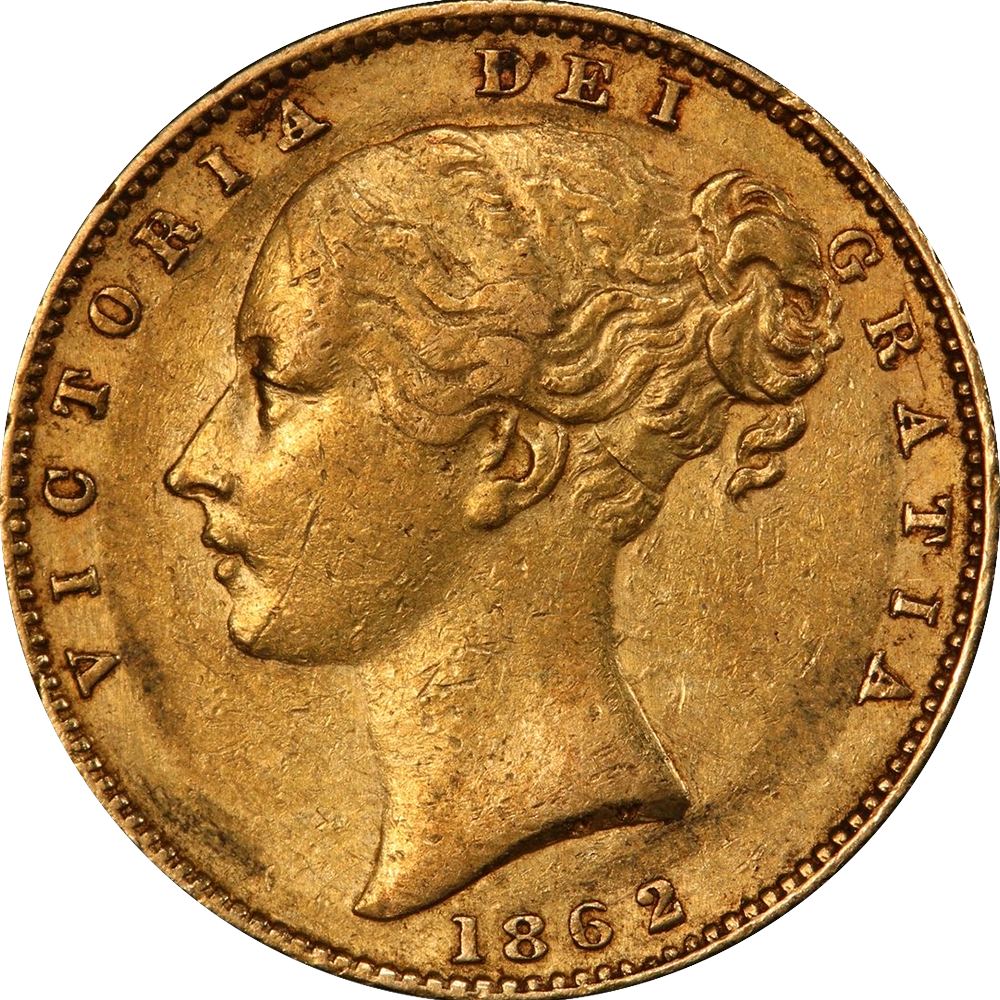 PRIX ET VALEUR DU MONNAIE GRADÉE PCGS AU53 SOUVERAIN VICTORIA BUSTE JEUNE ET ARMOIRIES 1862 WIDE DATE