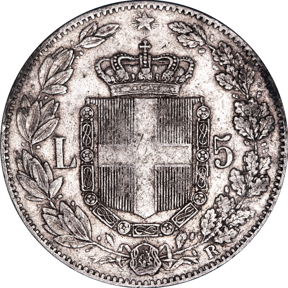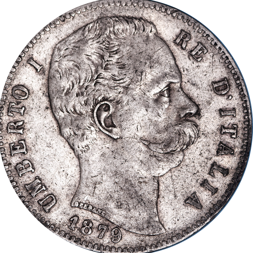 Description : Tête nue de Umberto 1er à droite avec encadrement en lettre latine et le millésime au dessous .