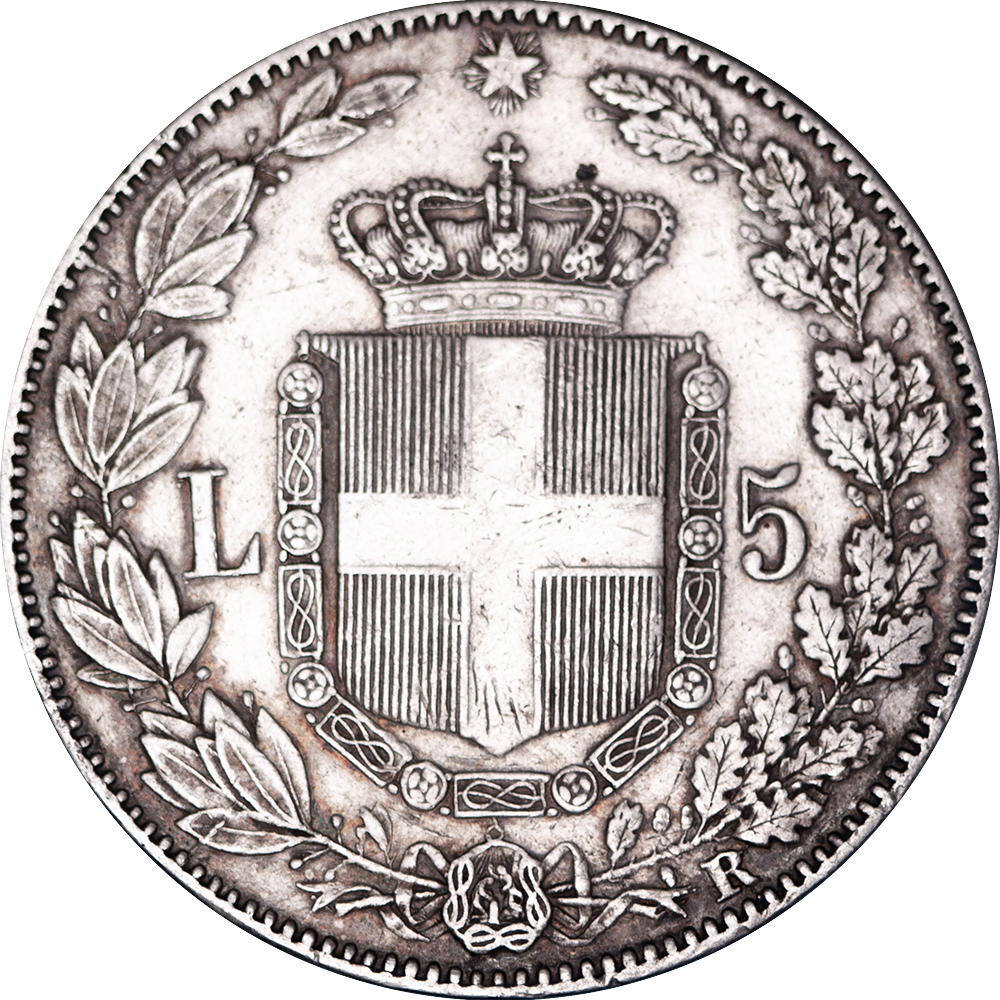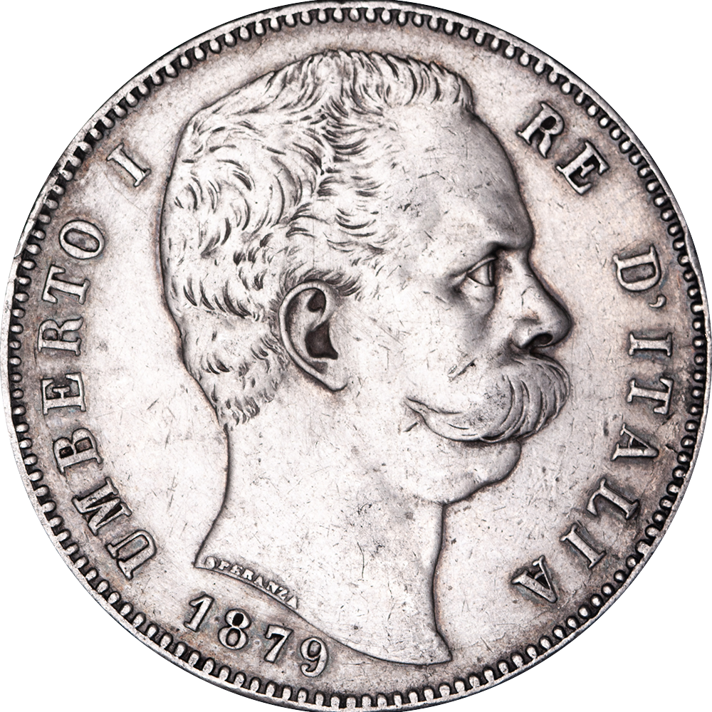 Description : Tête nue de Umberto 1er à droite avec encadrement en lettre latine et le millésime au dessous .