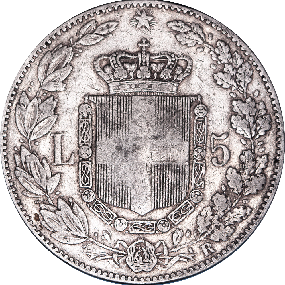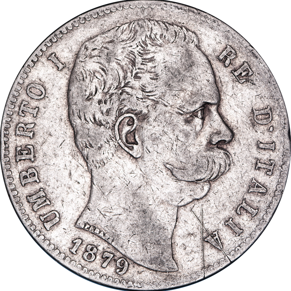 Description : Tête nue de Umberto 1er à droite avec encadrement en lettre latine et le millésime au dessous .